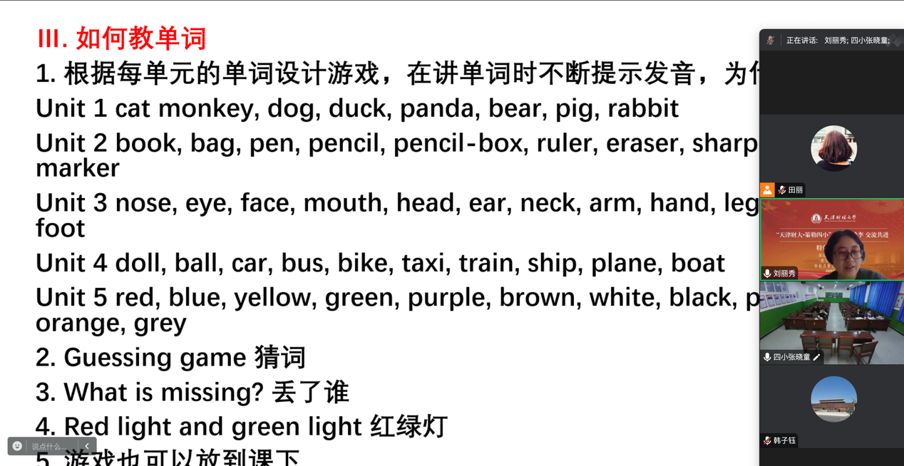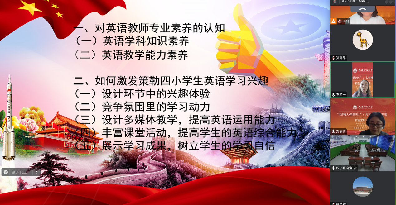 党委副书记孙高昂,英语系教师党支部书记韩子钰、支委宣传委员田丽、组织委员刘丽秀以及英语系优秀党员教师代表李若一教授,携手策勒四小全体英语教师一起于线上共建交流。本次交流旨在搭建东西部跨校外语教学虚拟教研交流平台,提升策勒四小英语教师的业务能力,激发学生对语言学习的兴趣。