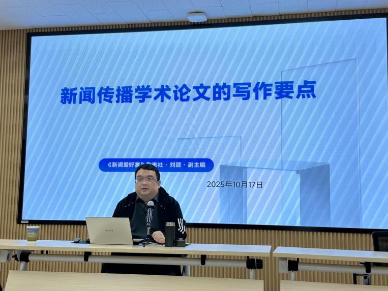 刘勰老师围绕“新闻传播学术论文写作要点”,从期刊概况、写作建议、投稿技巧和常见问题四个层面展开系统讲解。结合《新闻爱好者》的实践,刘老师详细介绍了该刊的栏目设置、审稿流程与发稿周期,为师生投稿提供了清晰指引。
