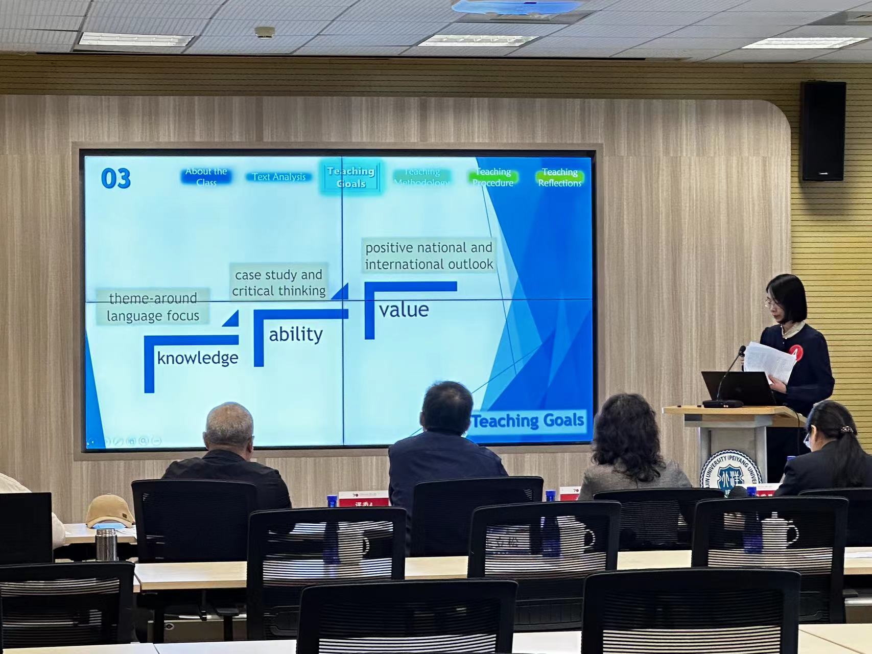 决赛中,张梦佳老师代表团队对课程思政教学设计进行说课展示,并回答评委问题。基于所抽取材料《中华人民共和国民法典》的制定与相关内容,整体教学设计思路既满足了大学英语教学中语言学习的基本目标,又引导学生理解法律制定和习近平主席“始终把人民放在心中最高位置”的思想,实现语言学习、技能获得和价值培养三位一体,将思政元素与大学英语课堂教学进行有效融合。
