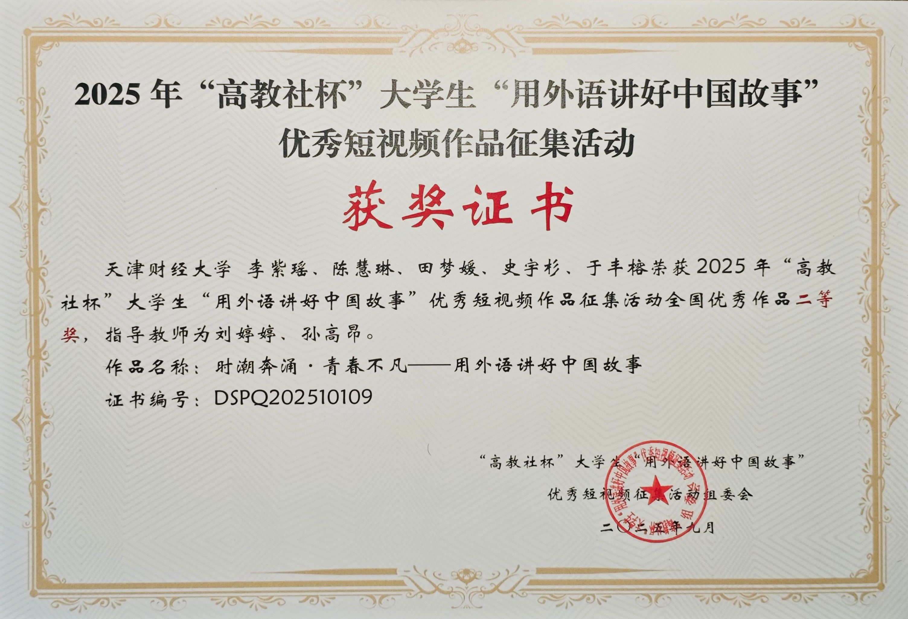 2024级广播电视学专业李紫瑶团队(英语笔译专业陈慧琳、田梦媛、于丰榕,外国语言学及应用语言学专业史宇杉)提交的作品《讲好中国故事 传播好中国声音》荣获全国优秀作品二等奖。